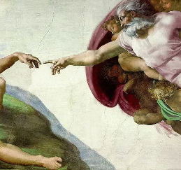 In it, God is depicted as an elderly white-bearded man, wrapped in a swirling cloak. God’s right arm is outstretched to impart the spark of life from his own finger into that of Adam, whose left arm is extended in a pose mirroring God’s, a reminder that man is created in the image and likeness of God (Gen. 1:26).